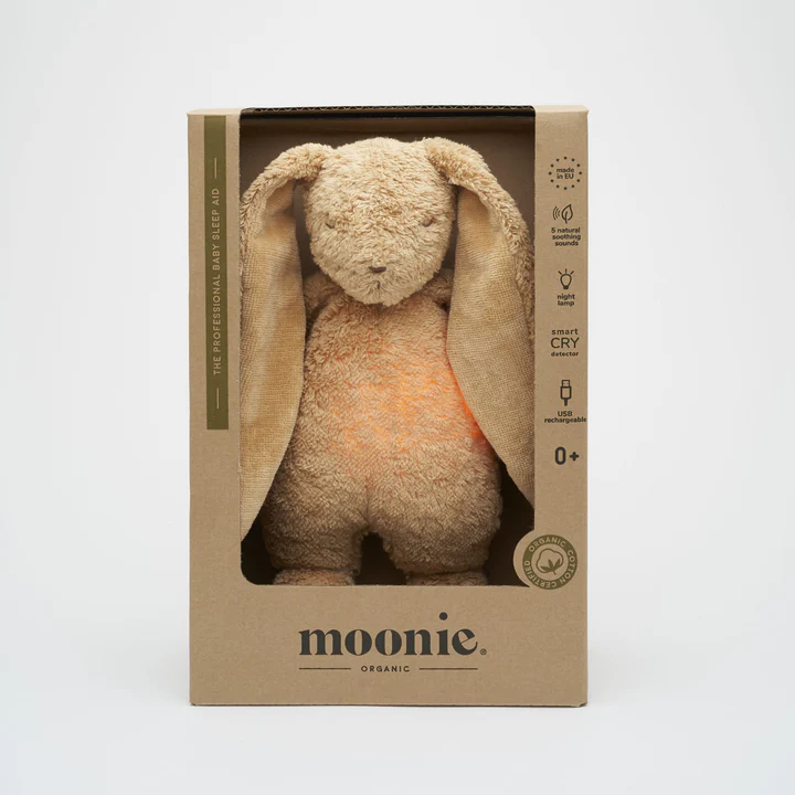 Humming Bunny MOONIE ORGANIC הוא עזר שינה פרימיום שמיועד לעזור לתינוקות להירדם בקלות יותר, עשוי מכותנה אורגנית מוסמכת. עם רעש ורוד מרגיע וטבעי, הוא עוזר לתינוקות להירגע ולהירדם מהר יותר. אך זה לא הכל! MOONIE גם משמש כמנורת לילה עם שבע אפשרויות צבע, כולל חיישן בכי, וטעינה באמצעות USB. אריזתו האלגנטית הופכת אותו למתנה מושלמת – פריט חובה בכל חדר תינוקות!