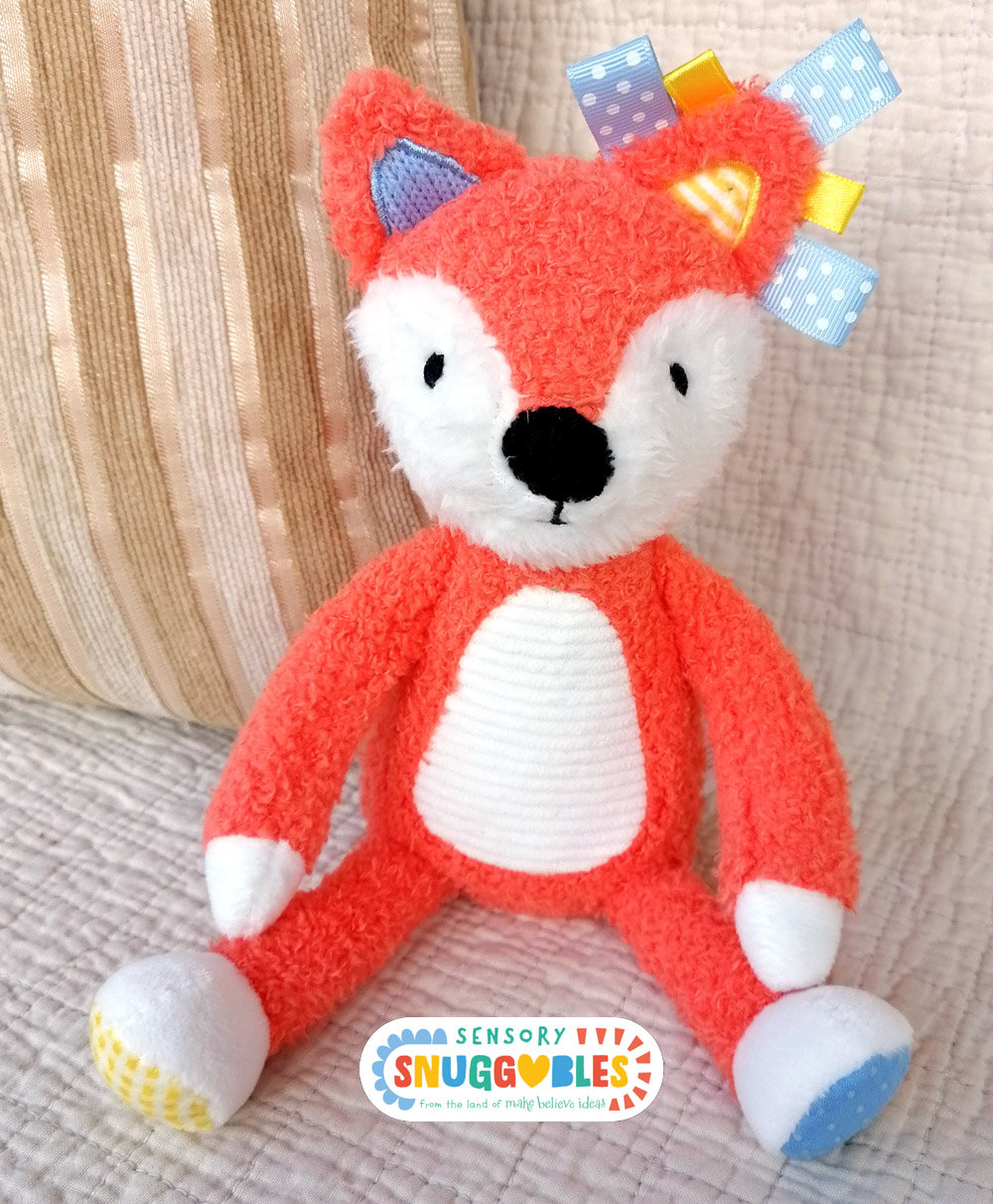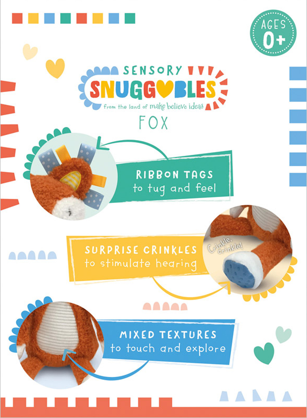 בובה רכה שועל מסדרת Snuggables,בובות רכות שמלוות תינוקות ופעוטות, מעודדות התפתחות וחקר חושי, עוזרות להם להרגע ומושלמות לחיבוק ולמשחק.געובתחתית כף רגלוהמרשרשת, משכו בתגיות המגוונות שעל אוזנו, חקרו ומששו את הטקסטורות השונות על בטנו, כפות רגליו ואזניו.שילוב חכם של טקסטורות, צבעים והדפסיםשונים בבובה שעוצבה לעורר ענין, חקר והתפתחות, לעודד למשחק ולהרגיע. הוא יושב ומצוין למשחקי דמיון. רך ונעים לחיבוק, הוא גם קטן דיו ונח לאחיזה בידייםקטנטנות, וקל לקחת אותו לכל מקום.מתנת לידה נהדרת.Make Believe Ideas הבריטיים יוצרים ספרי פעילות יחודיים ומקוריים באיכות מעולה. כל ספר עוצב ותוכנן כך שימשוך את הילד לבטא ולפתח את היכולות היצירתיות והלימודיות שלו, ובכל ספר מחשבה עיצובית או דידקטית מקורית.