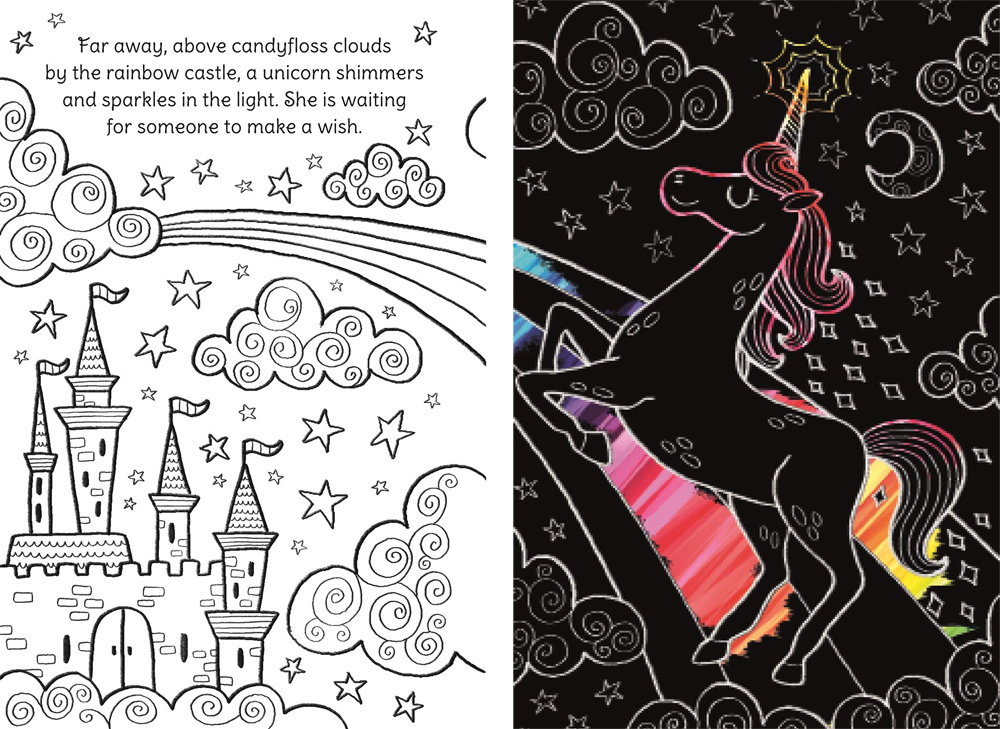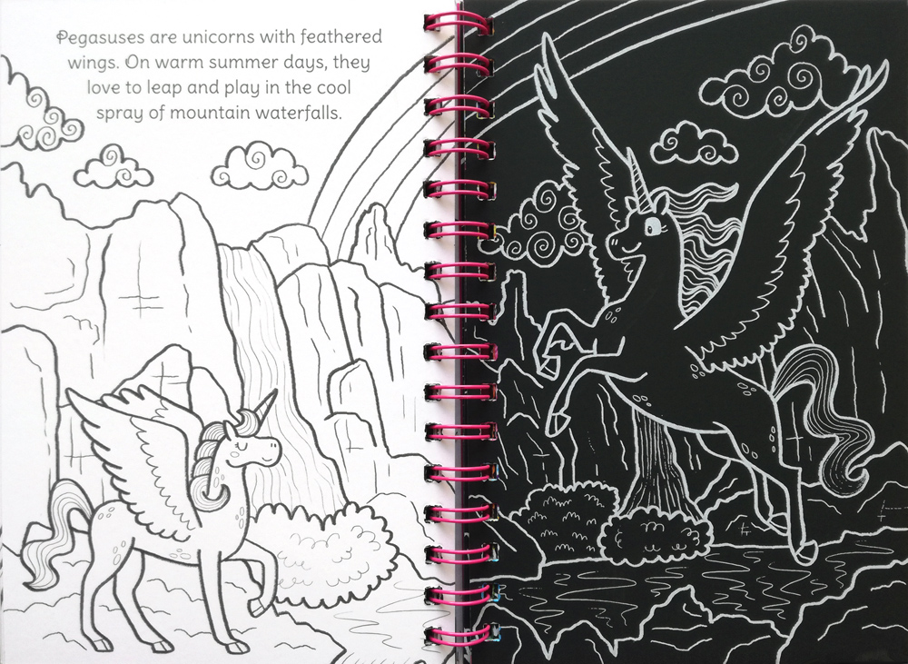 ספר יצירה שבו מגרדים דפי גירוד וצובעים דפים רגילים ליצירת תמונות מורכבות. בכל כפולת עמודים תמונה מחולקת לשניים: צידה השמאלי מיועד לצביעה ובו גם הסבר קצר על המוצג בתמונה וצידה הימני הוא דף שחור מיוחד. כשמגרדים אותו מתגלים צבעים מרהיבים. שימו לב לגרד חלקים בדף לפי בחירתכם לעיטור קישוט והדגשה אך לא את הדף כולו. בספר 19 תמונות כאלה. איך מגרדים? בכלי גירוד בצורת חד קרן השמור בתא שבכריכה.Igloo ו- Autumn הן הוצאות לאור בריטיות והן חברות בנות של קבוצת המדיה השוודית Bonnier. הן מפיקות מתנות וספרי פעילות שמשמחים ילדים ומבוגרים.